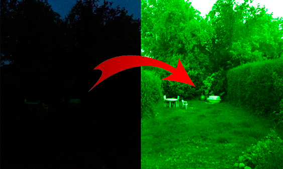 - Modo Noturno Clássico: amplifica a luz disponível e aplica filtro verde característico da visão noturna tradicional